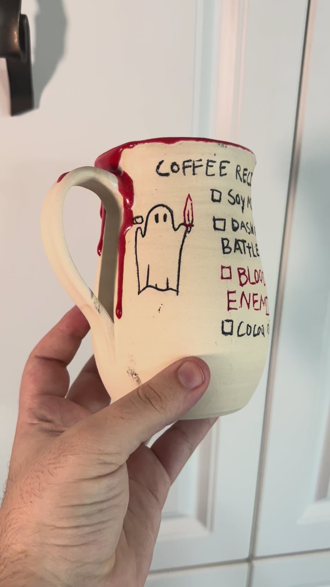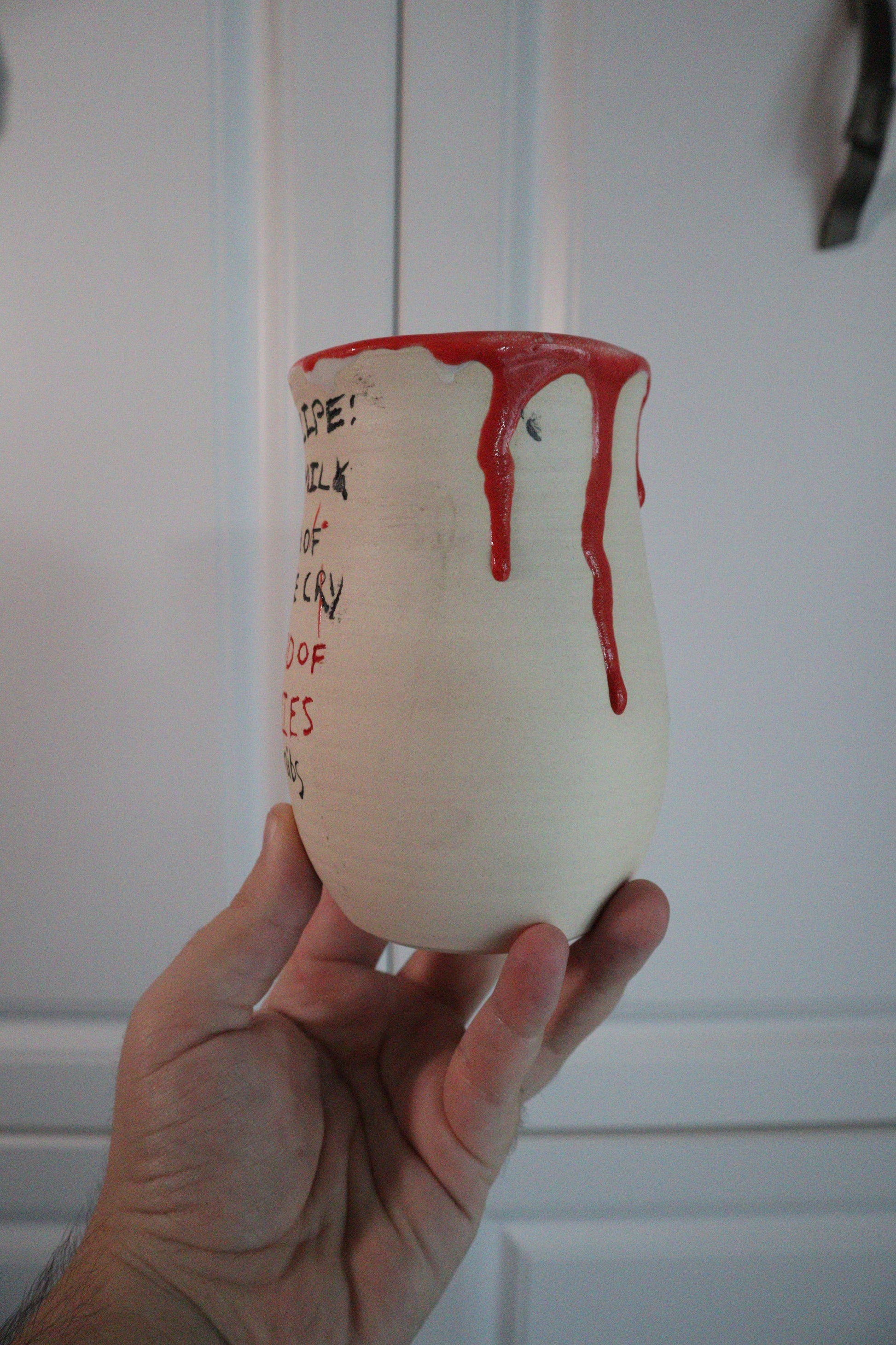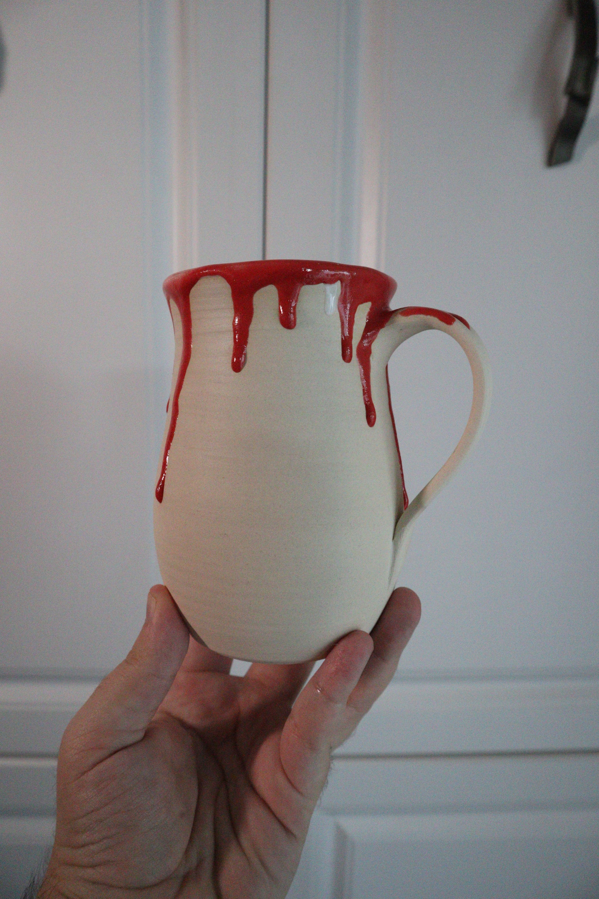 This hand-carved mug holds over 12 ounces—perfect for that extra-strong morning brew or your favorite killer coffee recipe. The unglazed exterior leaves a gritty and raw texture that contrasts wickedly with the blood-red glaze. Though it looks sinister, it’s fully food-safe, dishwasher-safe, and microwave-safe—so you can sip, savor, and slay your daily caffeine ritual with ease.