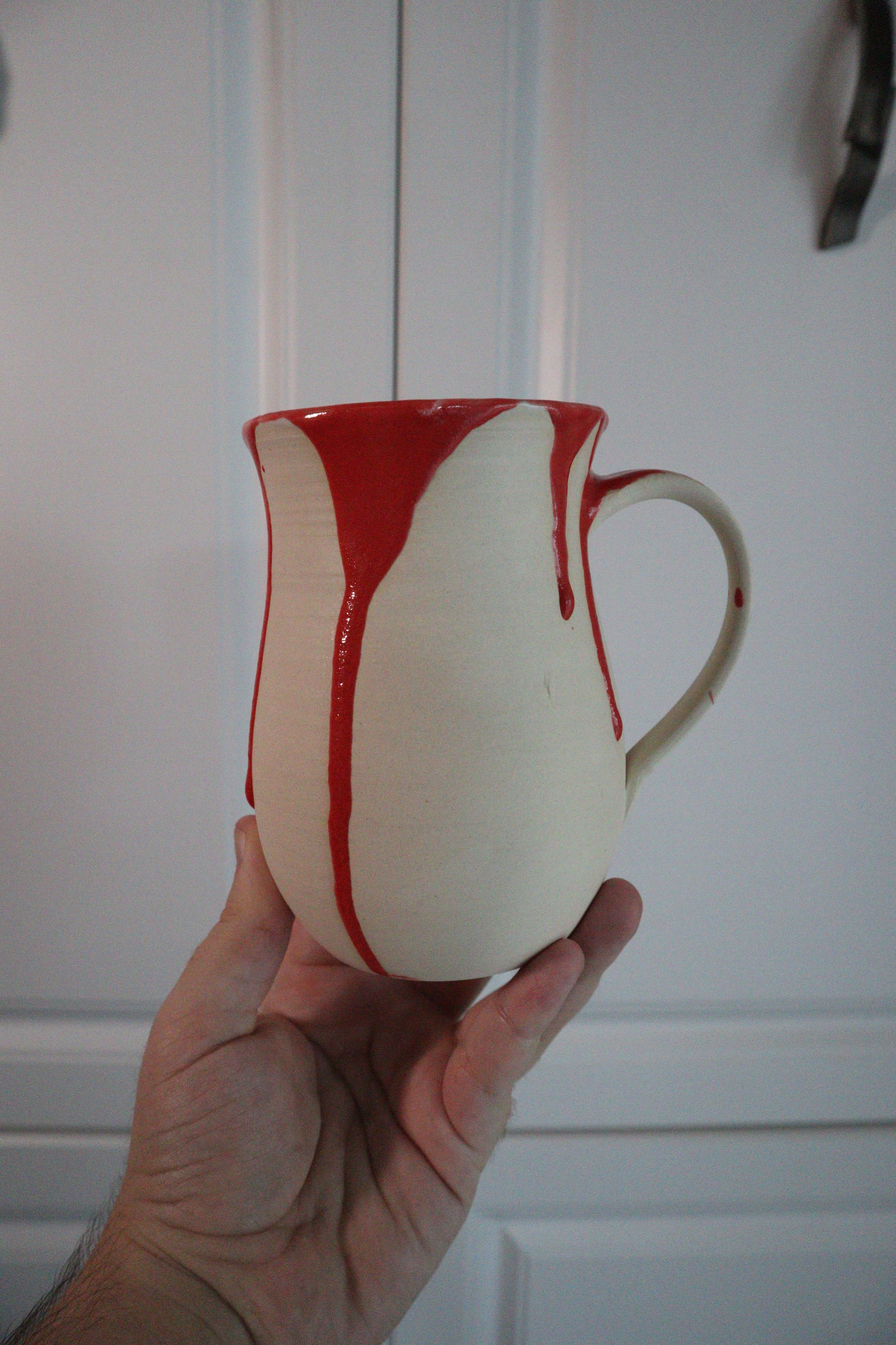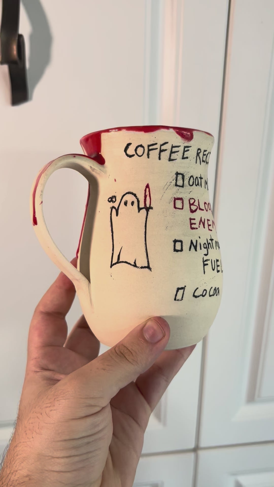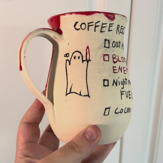 This hand-carved mug holds over 12 ounces—perfect for that extra-strong morning brew or your favorite killer coffee recipe. The unglazed exterior leaves a gritty, raw texture that contrasts wickedly with the blood-red glaze, like cream swirling into black coffee. Though it looks sinister, it’s fully food-safe, dishwasher-safe, and microwave-safe—so you can sip, savour, and slay your daily caffeine ritual with ease.
