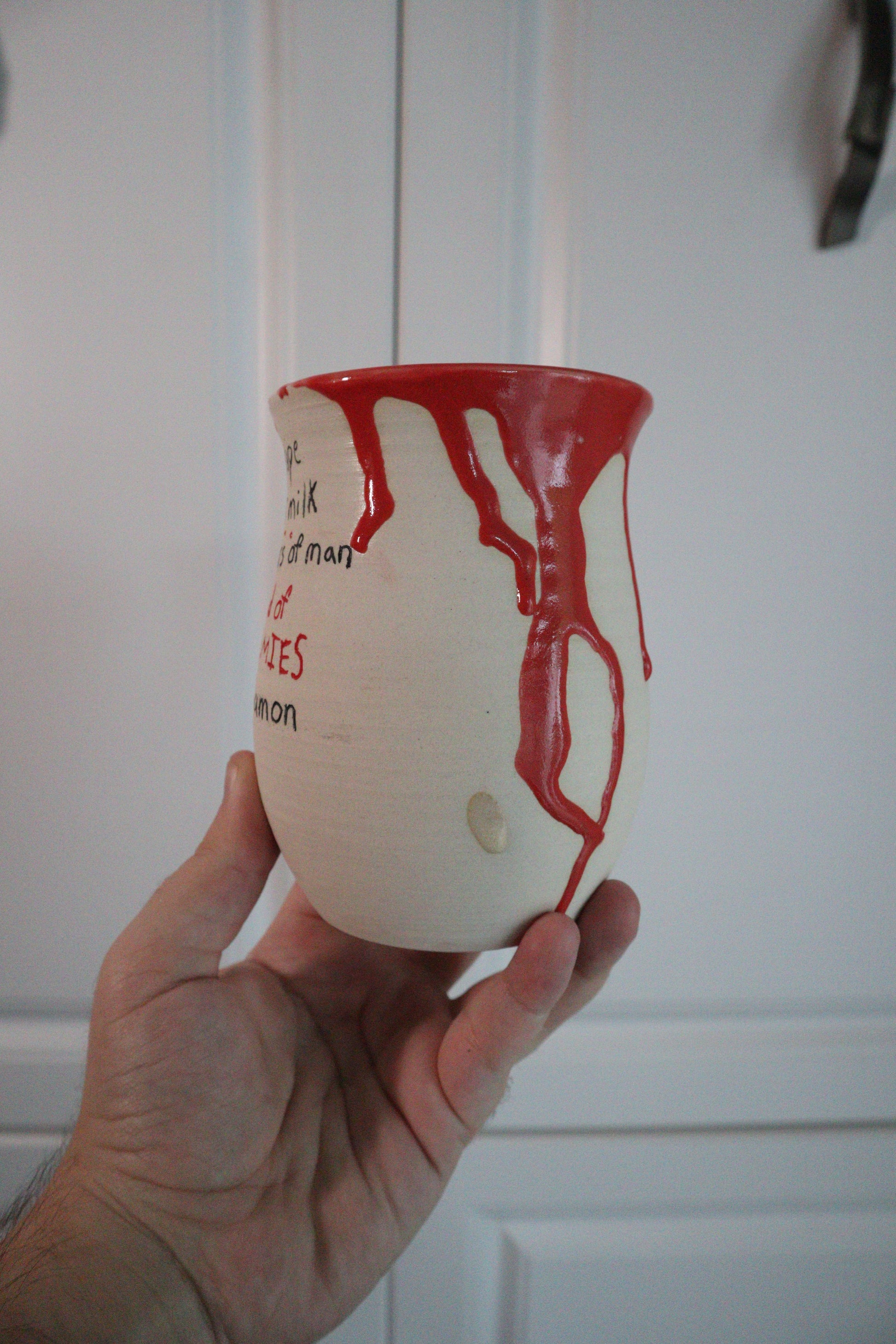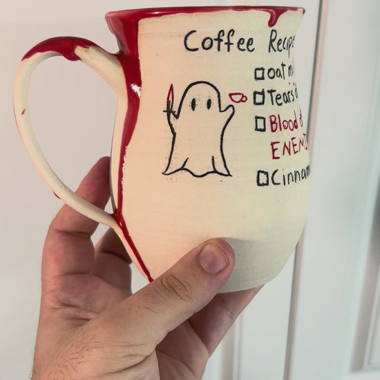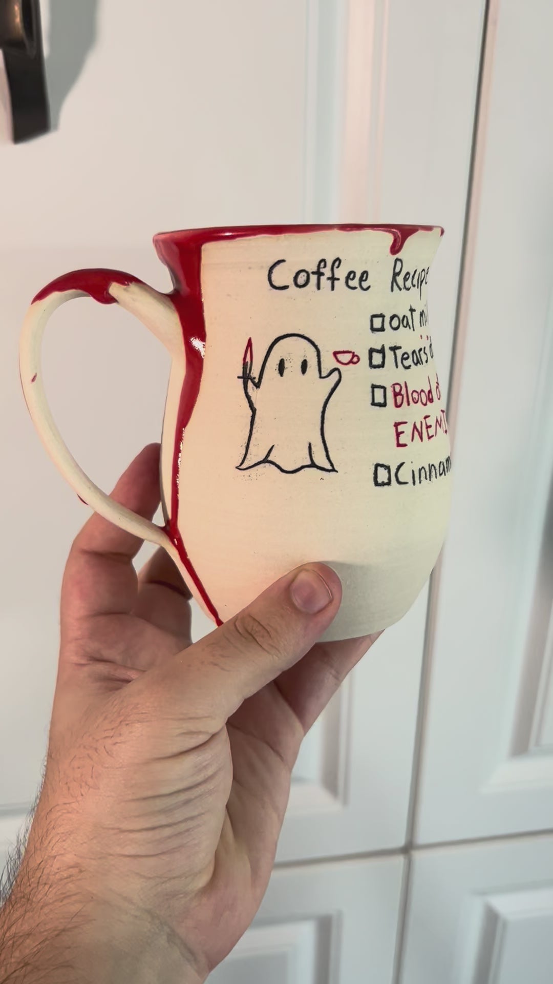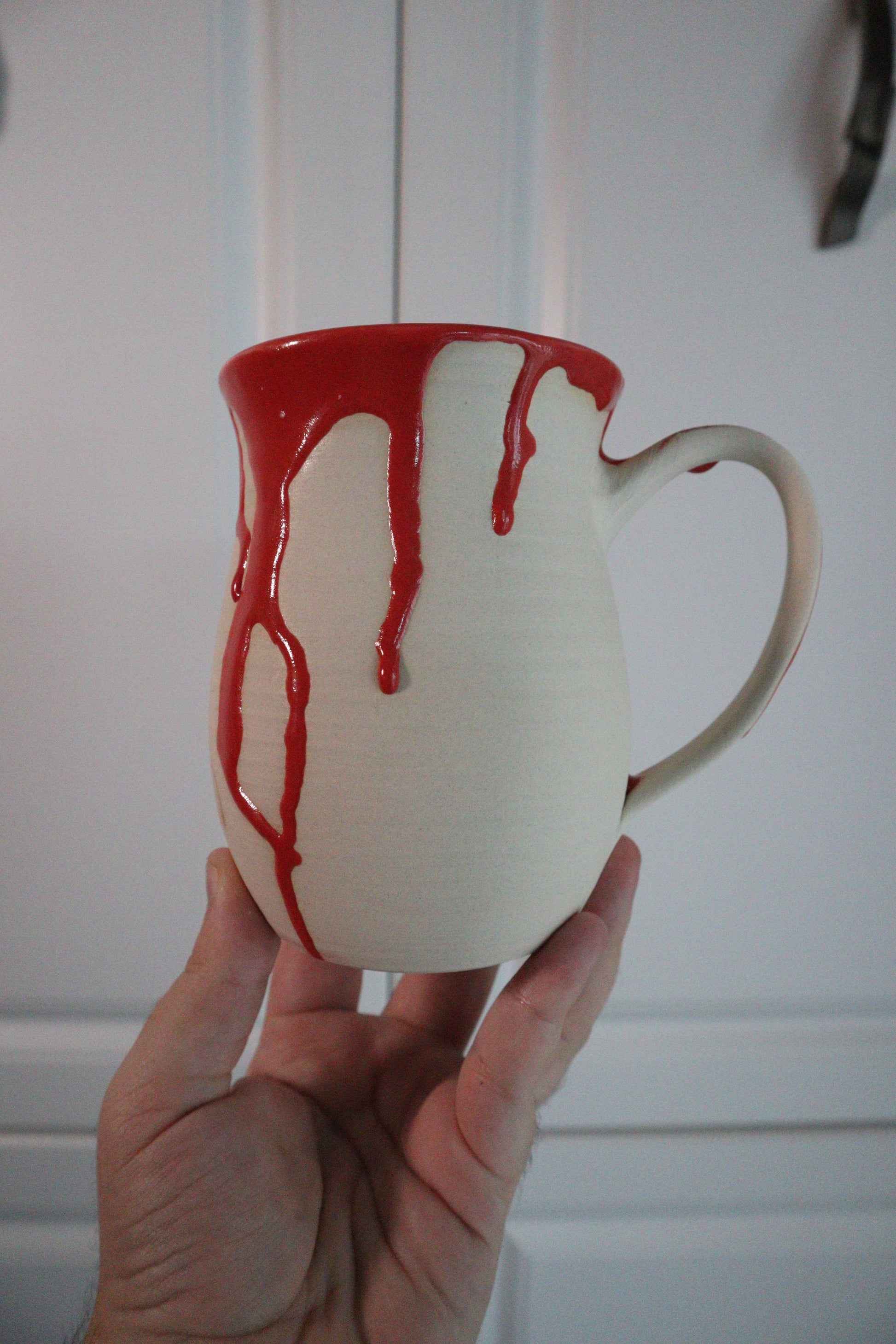 This hand-carved mug holds over 12 ounces—perfect for that extra-strong morning brew or your favorite killer coffee recipe. The unglazed exterior leaves a gritty, raw texture that contrasts wickedly with the blood-red glaze, like cream swirling into black coffee. Though it looks sinister, it’s fully food-safe, dishwasher-safe, and microwave-safe—so you can sip, savor, and slay your daily caffeine ritual with ease.