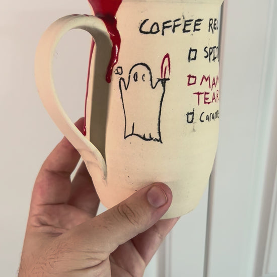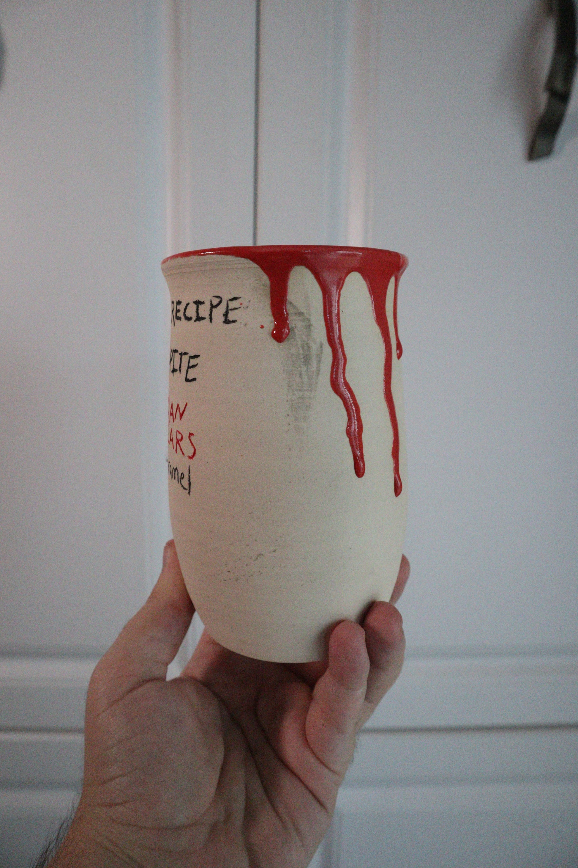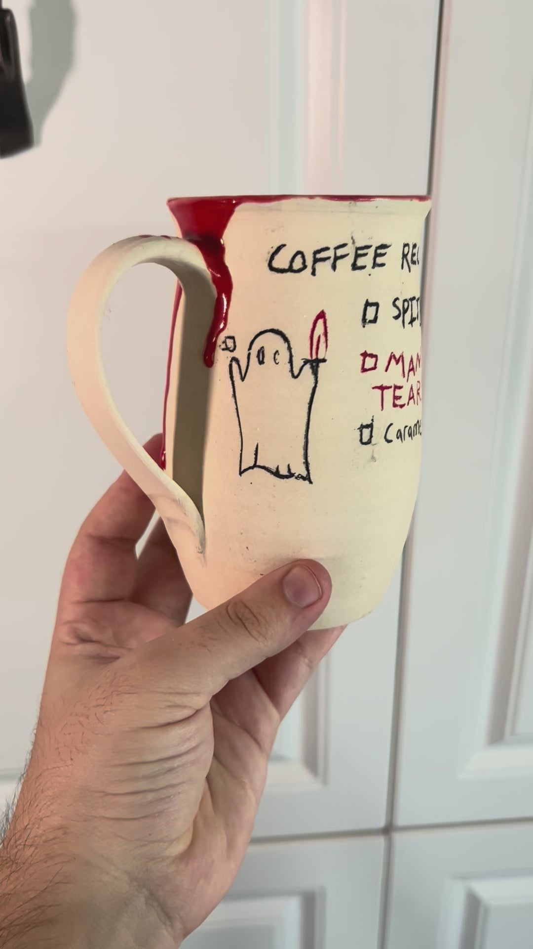 This hand-carved mug holds over 12 ounces—perfect for that extra-strong morning brew or your favorite killer coffee recipe. The unglazed exterior leaves a gritty, raw texture that contrasts wickedly with the blood-red glaze, like cream swirling into black coffee. Though it looks sinister, it’s fully food-safe, dishwasher-safe, and microwave-safe—so you can sip, savor, and slay your daily caffeine ritual with ease.