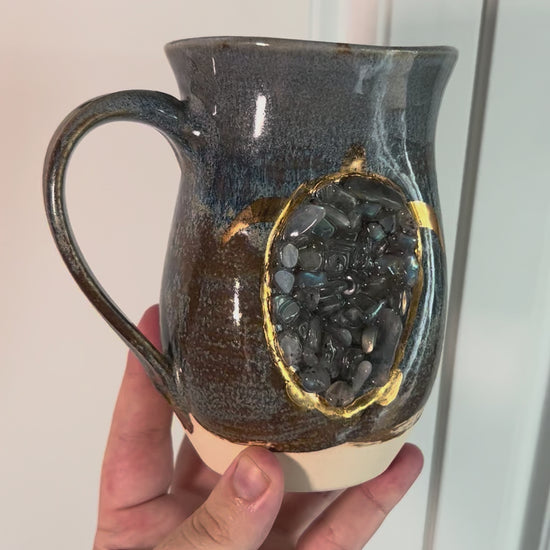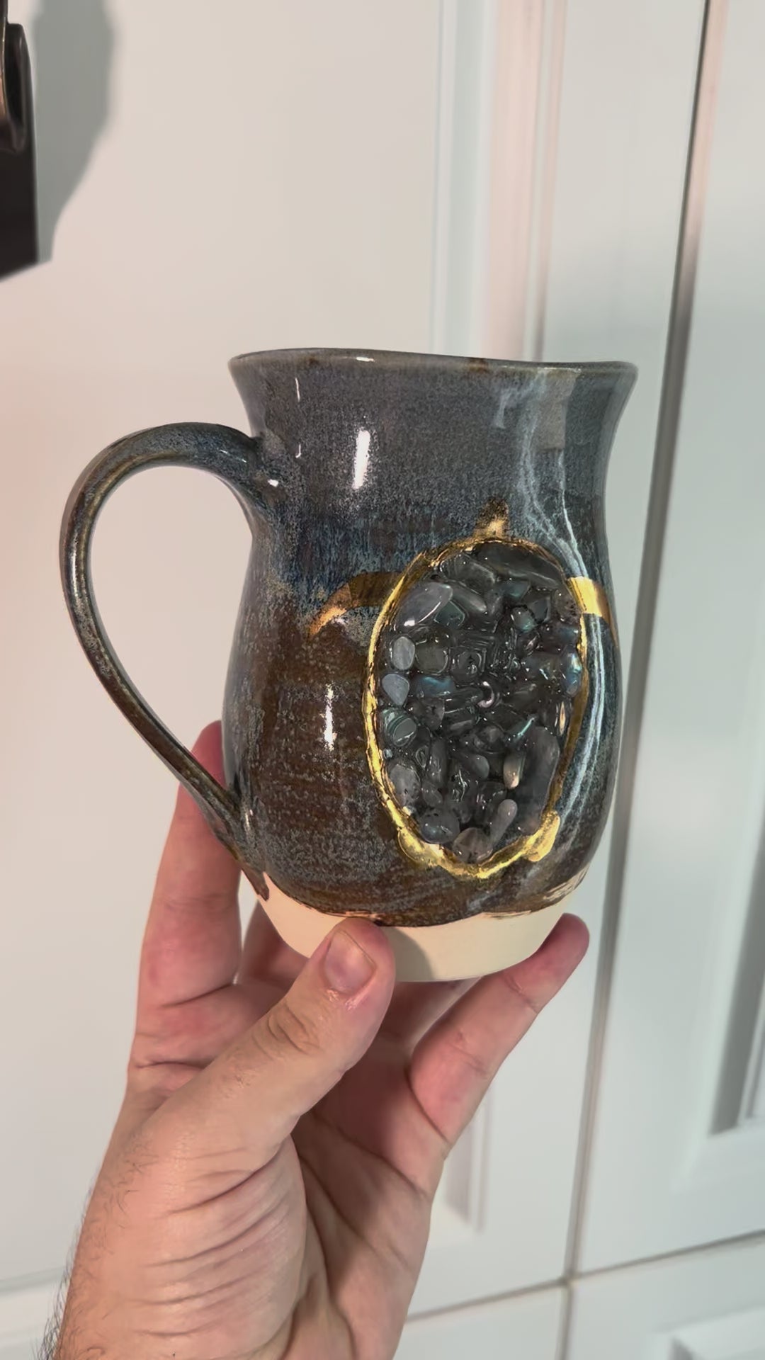 Brew your magic in style with this hand-painted mug, adorned with shimmering 22k gold. Holding over 12 ounces, it’s the perfect vessel for potions, coffee spells, or moonlit teas. Infused with the energy of Labradorite, it radiates intuition, transformation, and protection—guiding your spirit while you sip. Please note: this treasure is hand wash only and not microwave safe—treat it like the sacred object it is.