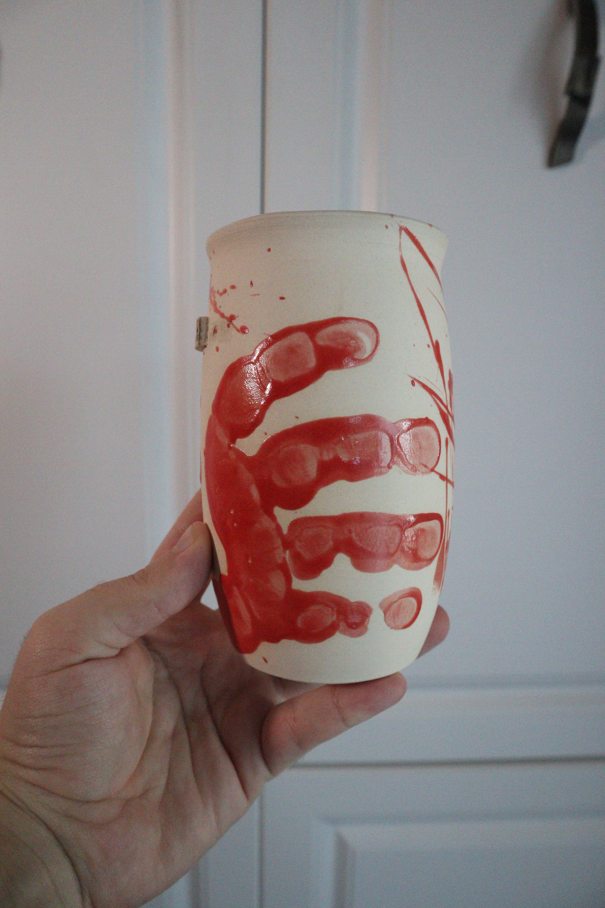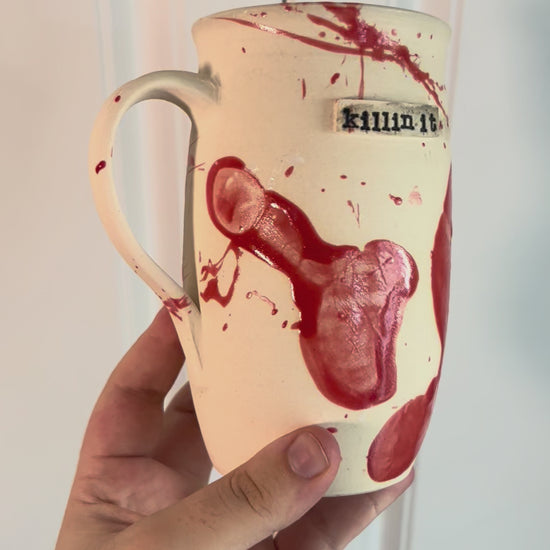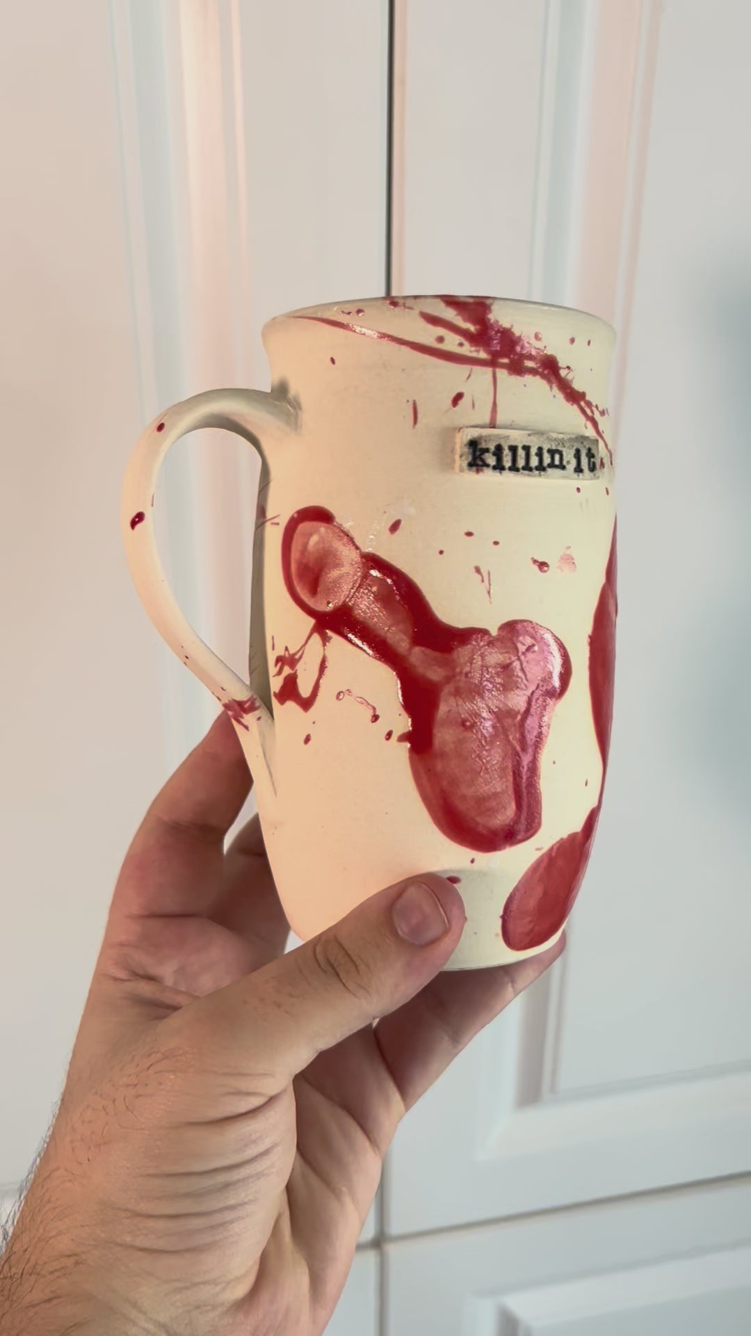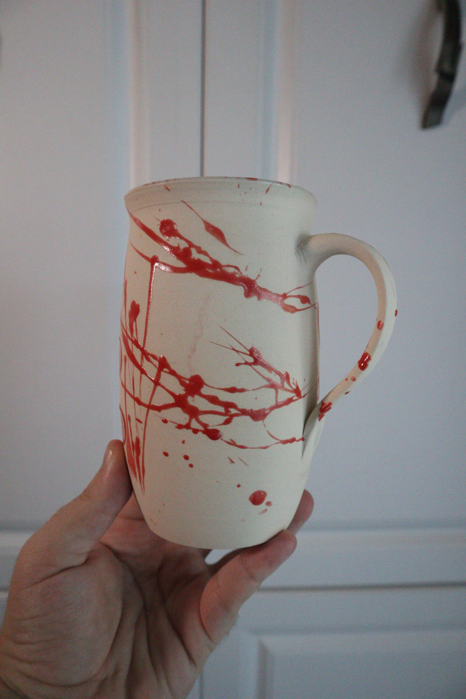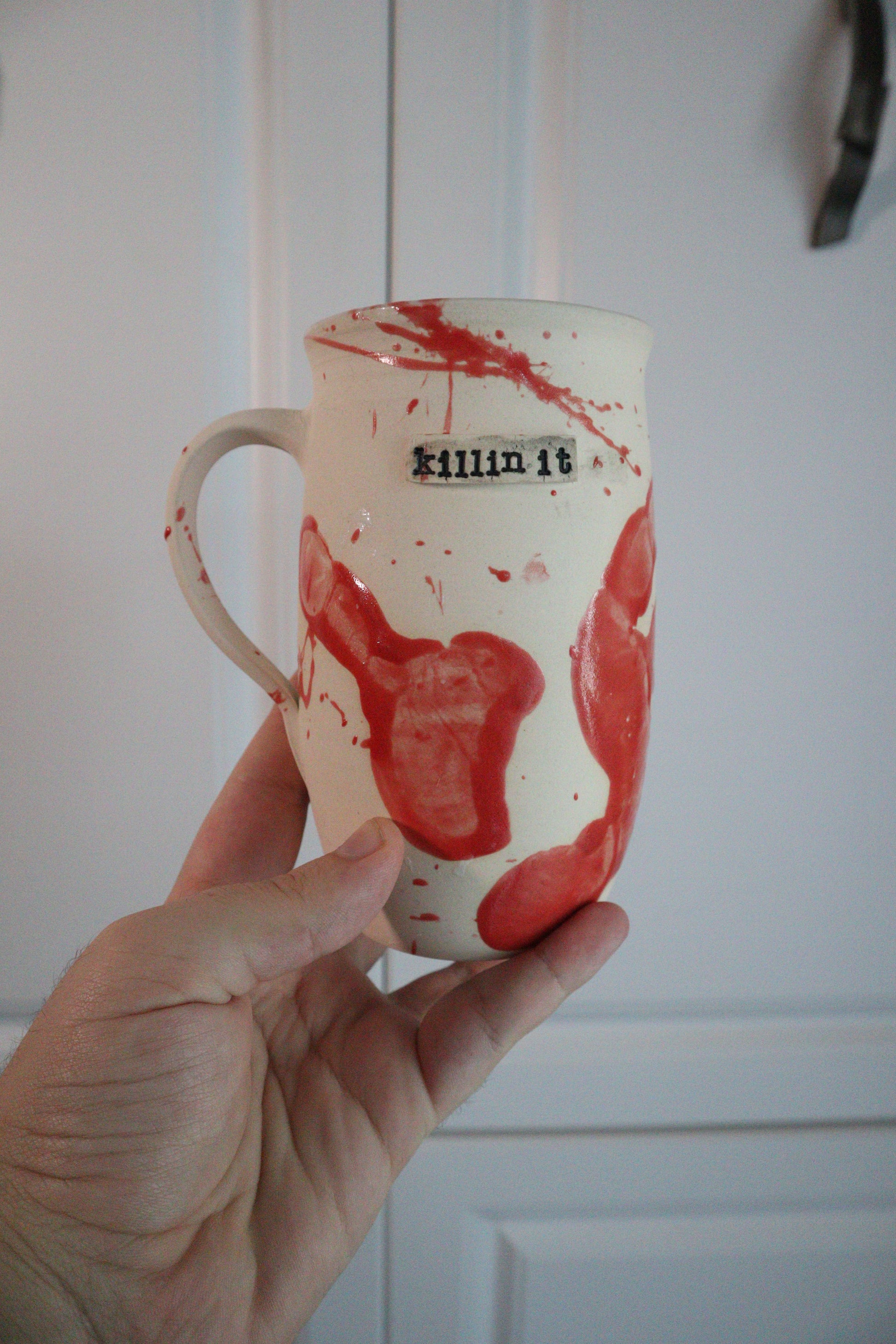 For mornings when you’re killin’ it (literally). This hand-carved mug holds 12+ ounces and features blood-red splatter with bold lettering that makes a statement. The unglazed exterior gives a bone-dry feel against the crimson glaze, making it as creepy as it is functional. Food-safe, dishwasher-safe, and microwave-safe—no clean-up horrors here.