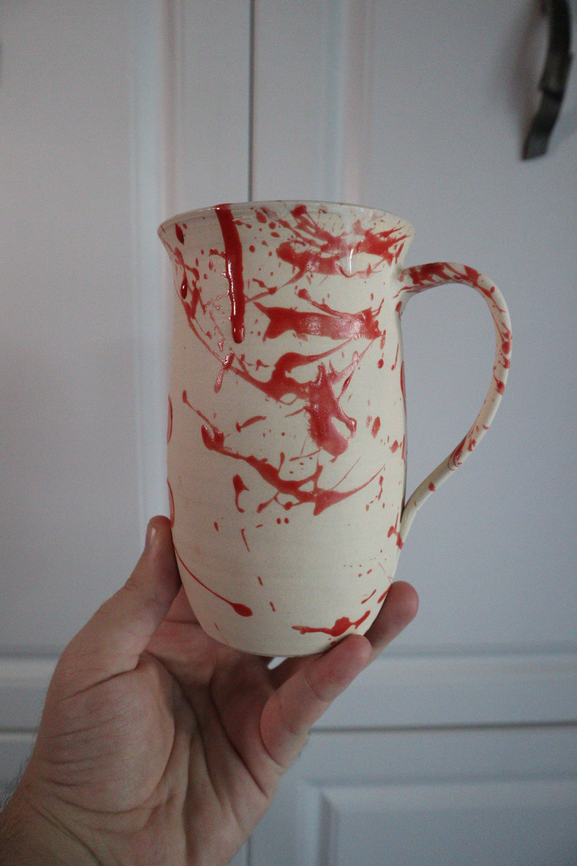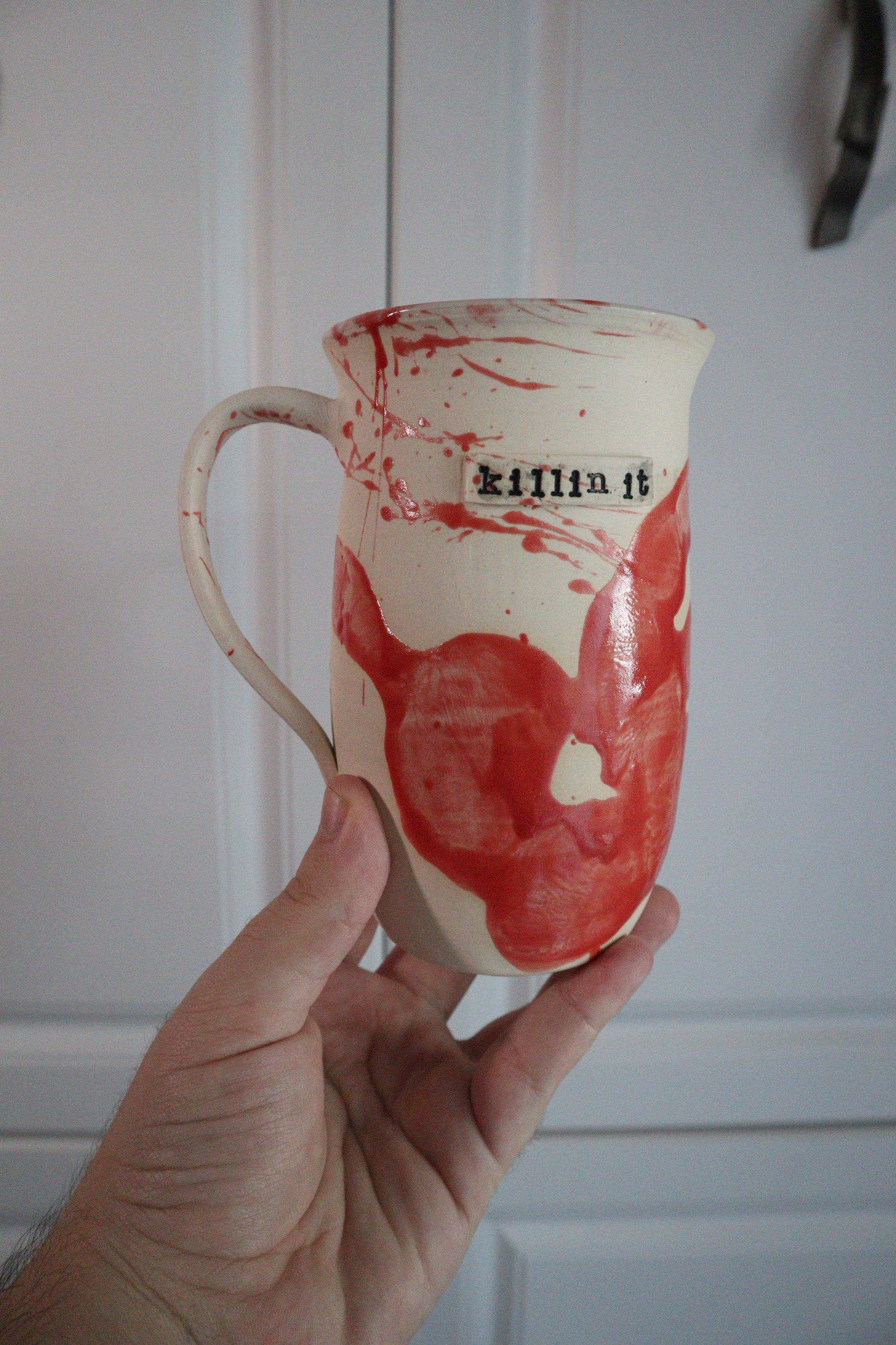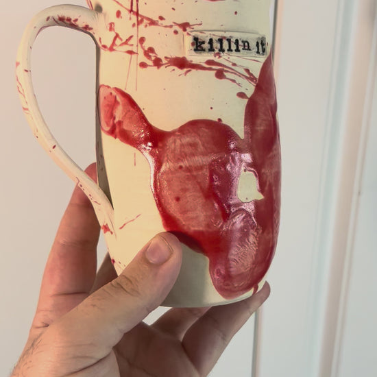 For mornings when you’re killin’ it (literally). This hand-carved mug holds 12+ ounces and features blood-red splatter with bold lettering that makes a statement. The unglazed exterior gives a bone-dry feel against the crimson glaze, making it as creepy as it is functional. Food-safe, dishwasher-safe, and microwave-safe—no clean-up horrors here.