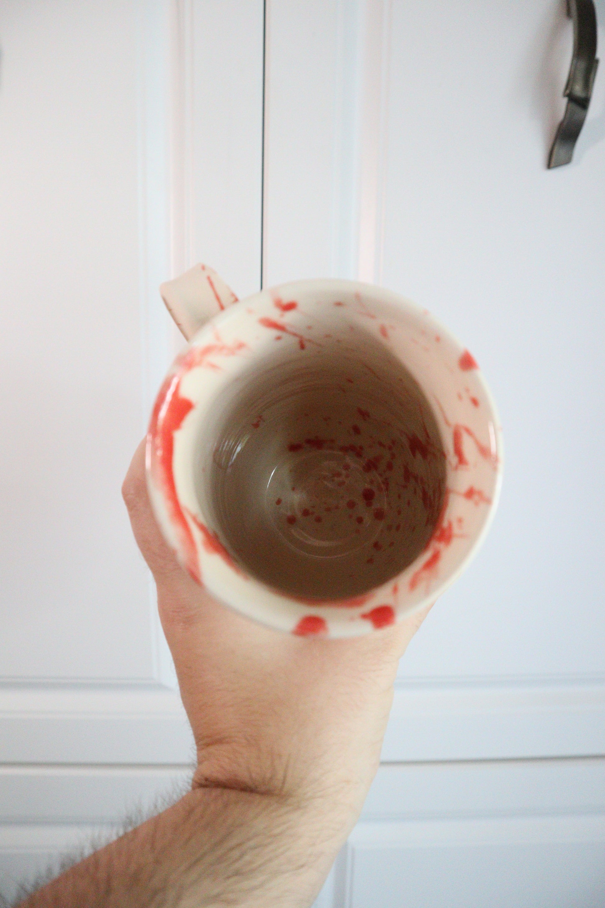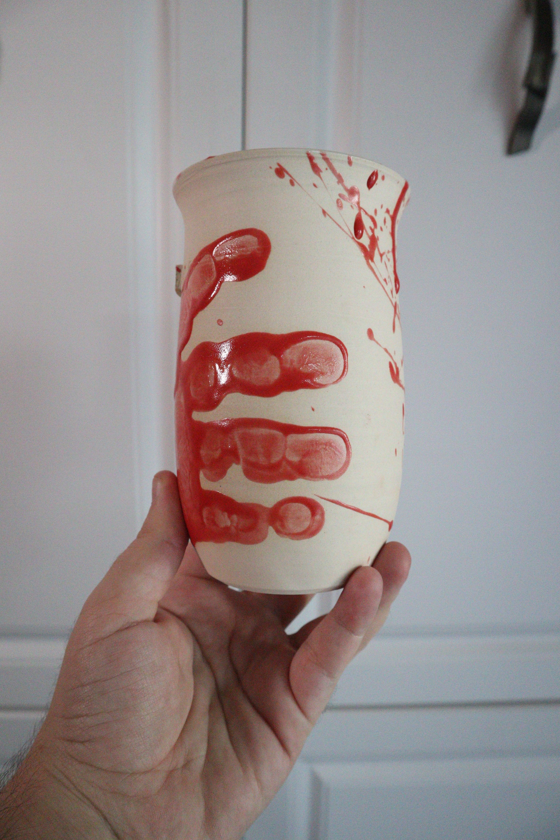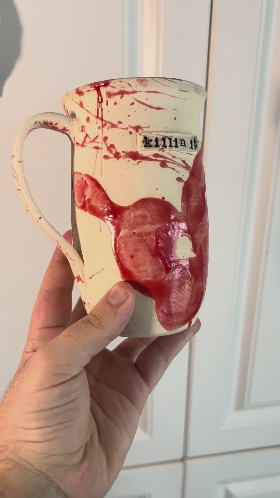 For mornings when you’re killin’ it (literally). This hand-carved mug holds 12+ ounces and features blood-red splatter with bold lettering that makes a statement. The unglazed exterior gives a bone-dry feel against the crimson glaze, making it as creepy as it is functional. Food-safe, dishwasher-safe, and microwave-safe—no clean-up horrors here.