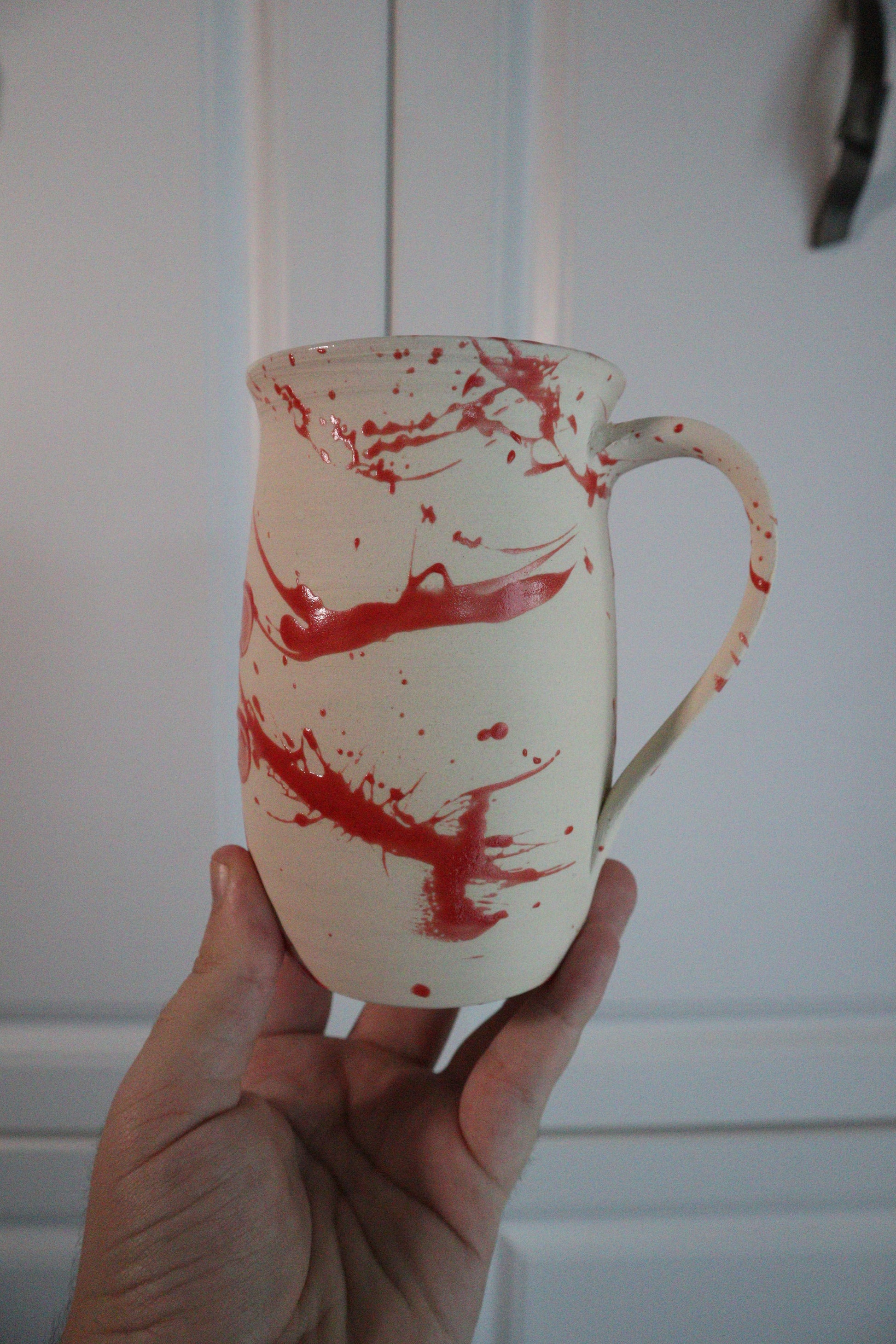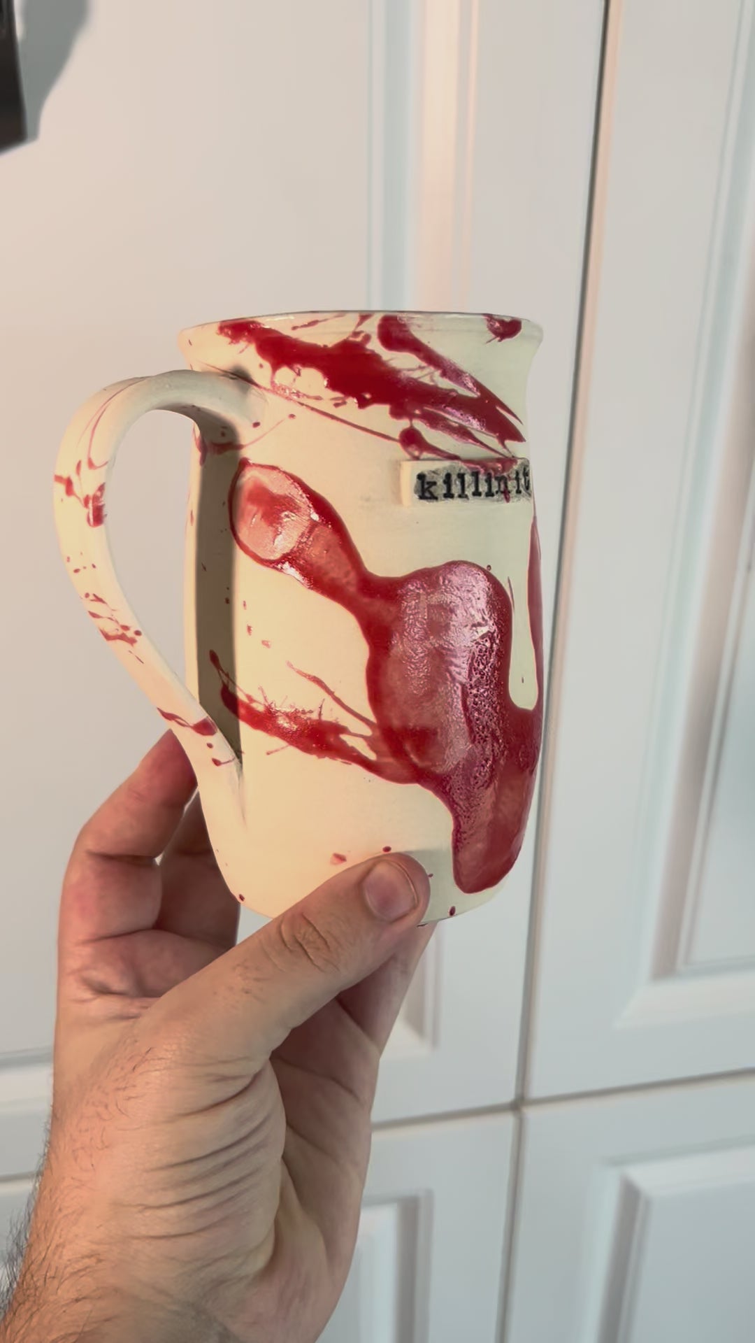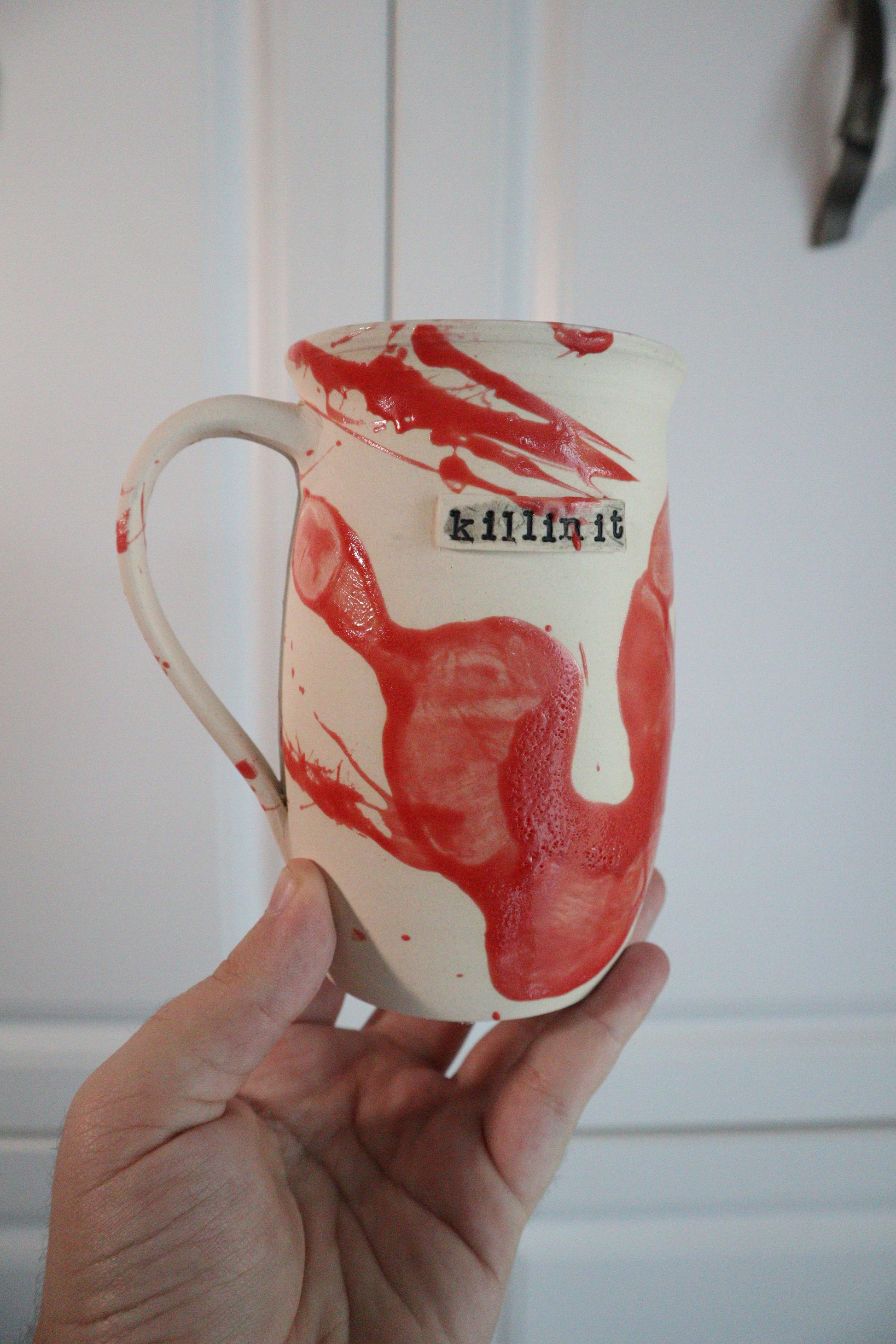 For mornings when you’re killin’ it (literally). This hand-carved mug holds 12+ ounces and features blood-red splatter with bold lettering that makes a statement. The unglazed exterior gives a bone-dry feel against the crimson glaze, making it as creepy as it is functional. Food-safe, dishwasher-safe, and microwave-safe—no clean-up horrors here.