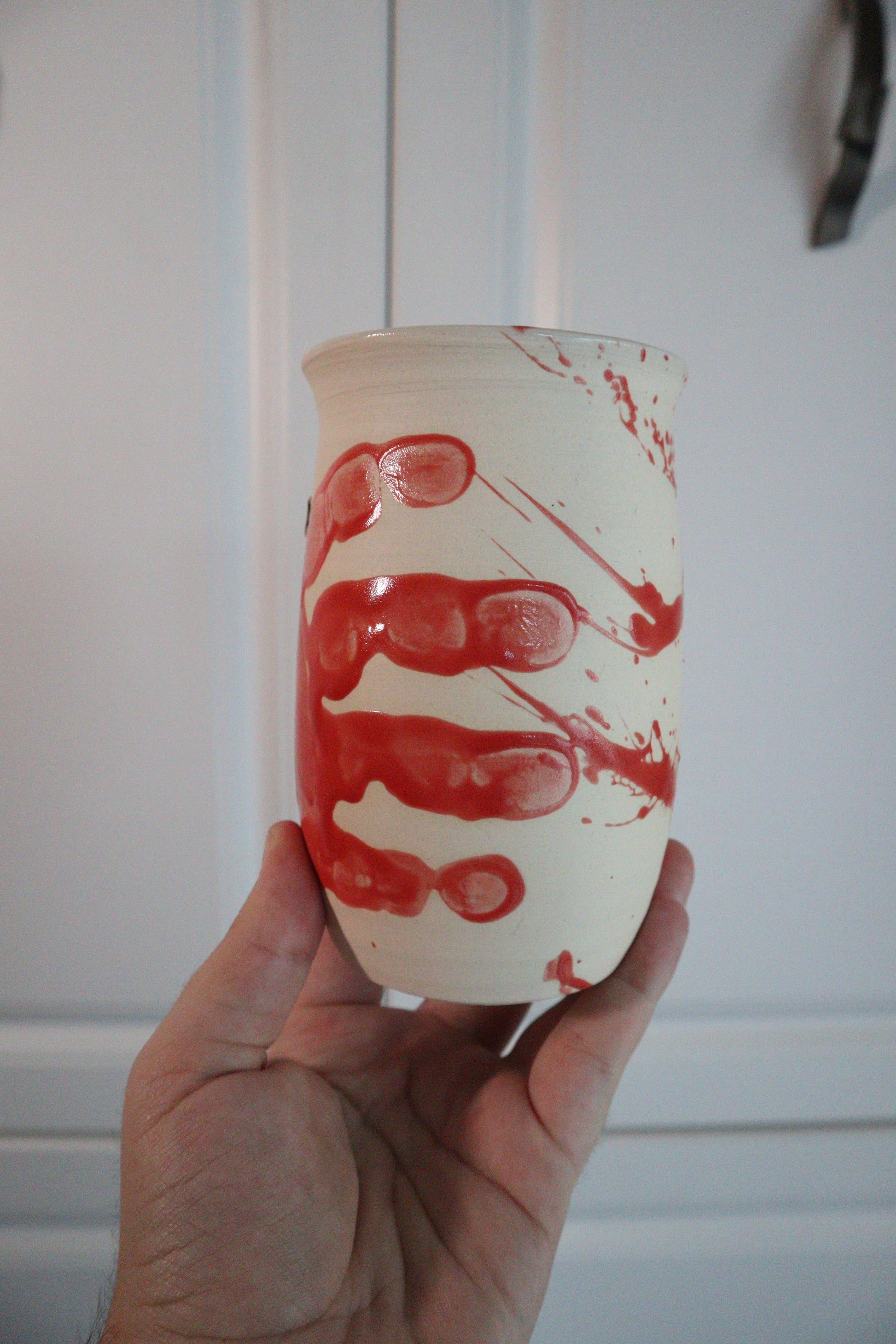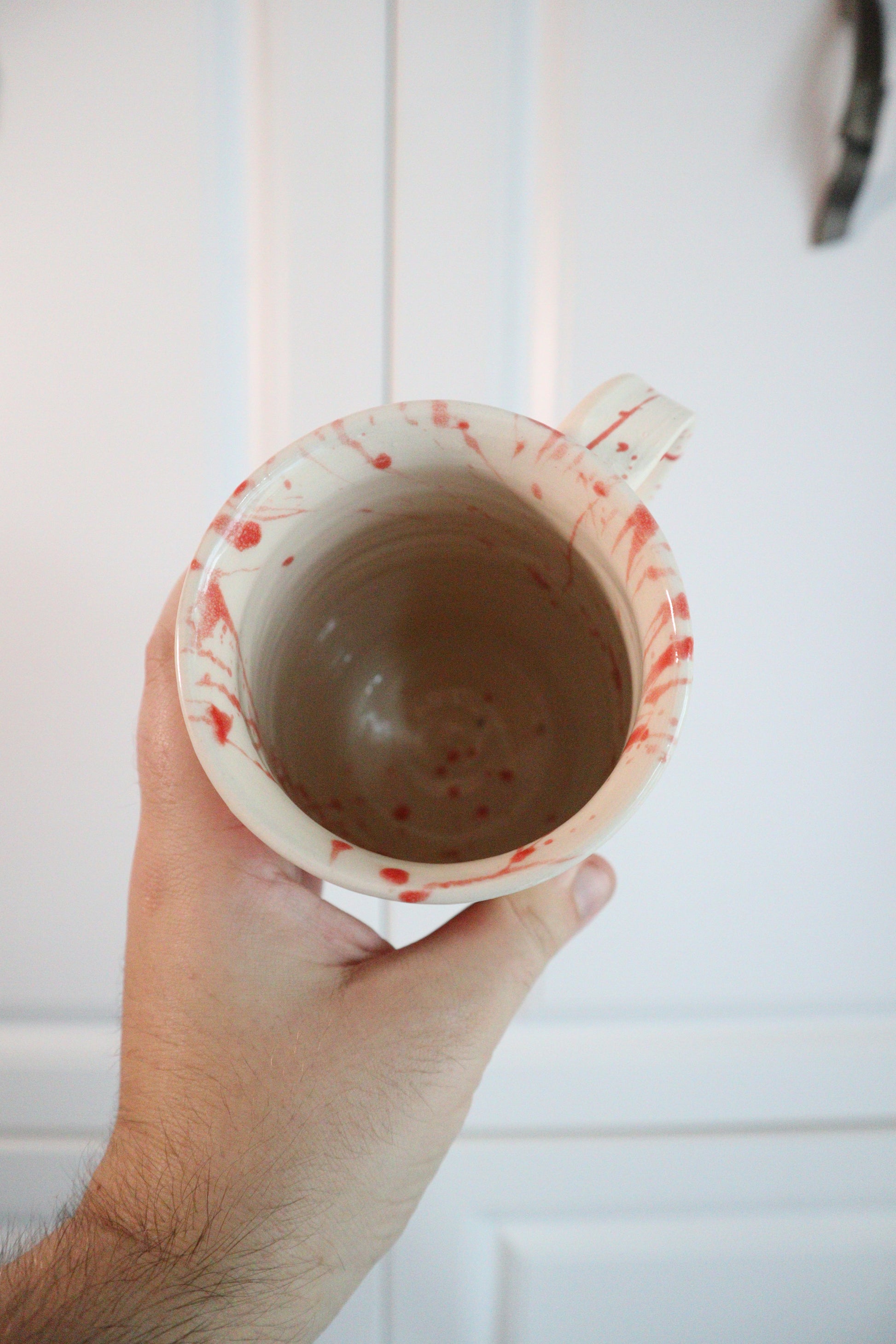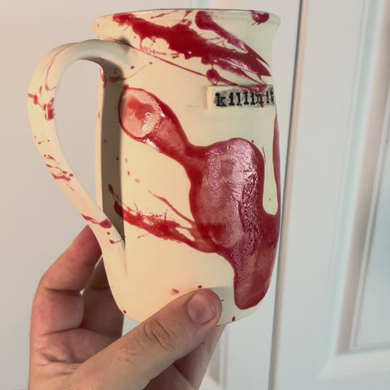 For mornings when you’re killin’ it (literally). This hand-carved mug holds 12+ ounces and features blood-red splatter with bold lettering that makes a statement. The unglazed exterior gives a bone-dry feel against the crimson glaze, making it as creepy as it is functional. Food-safe, dishwasher-safe, and microwave-safe—no clean-up horrors here.