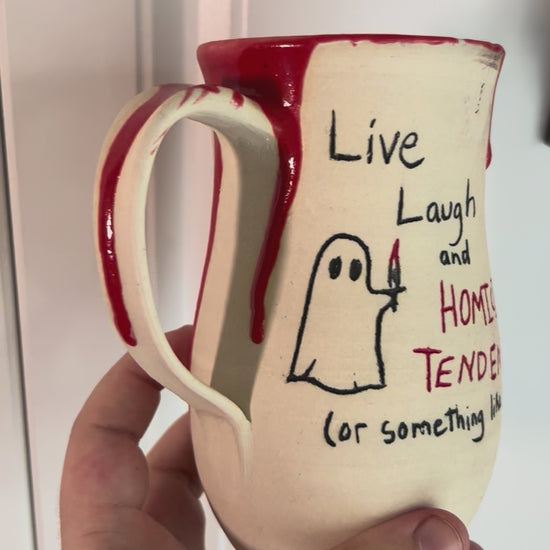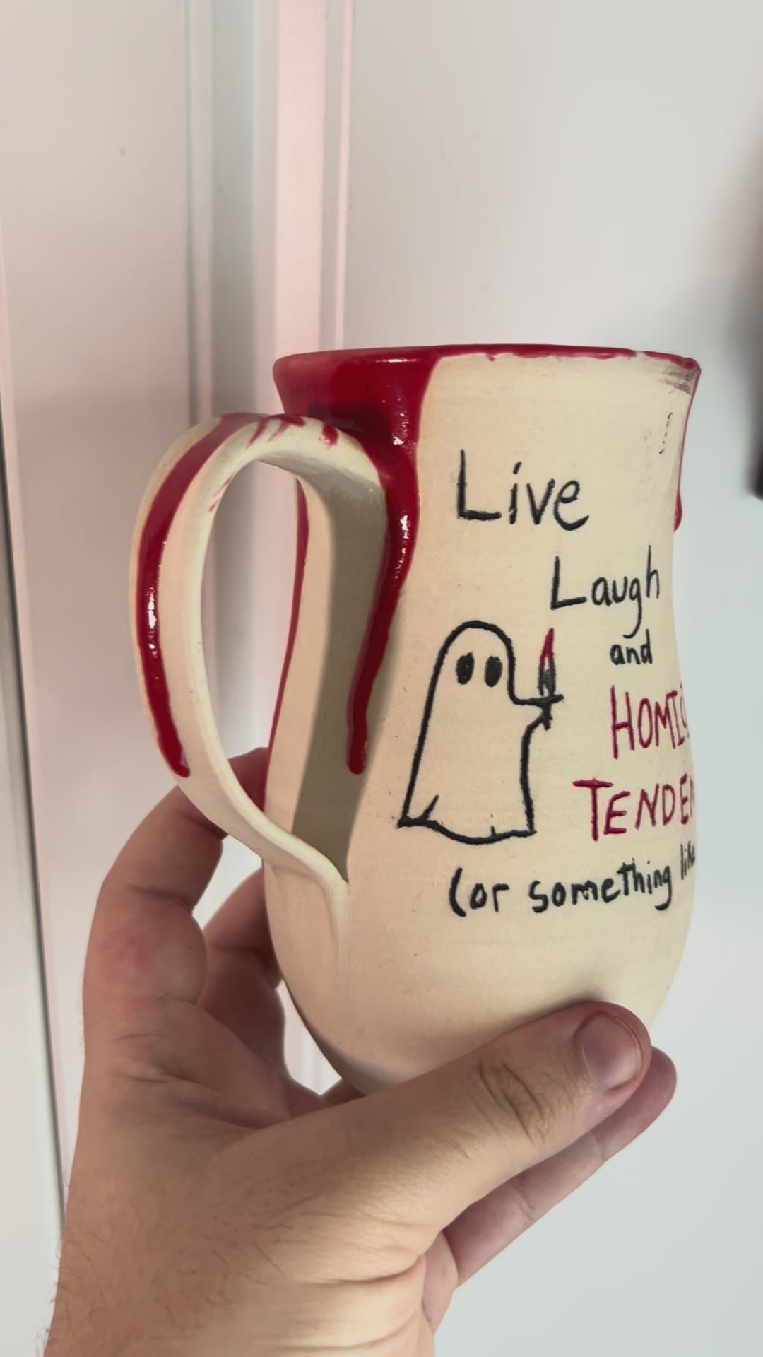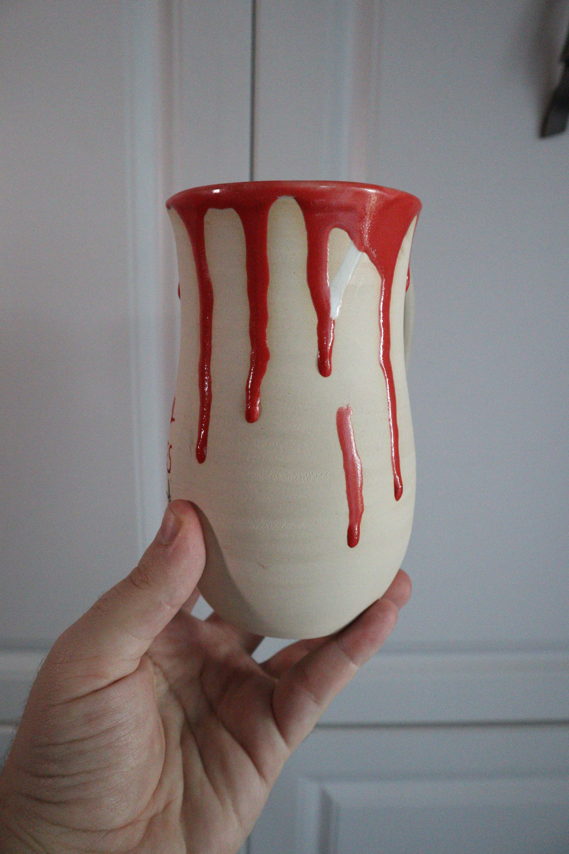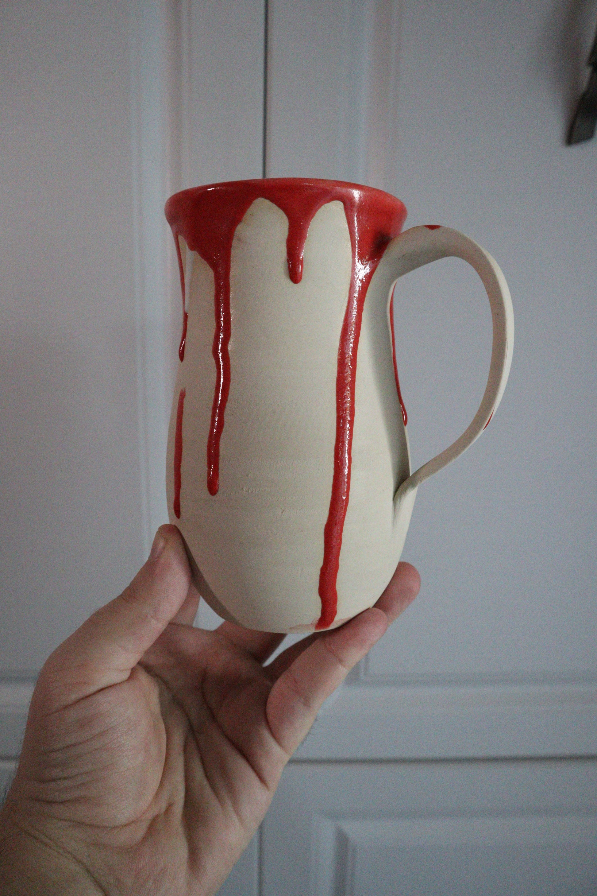 Hand-carved and ready to hold 12+ ounces of your brews, elixirs, or midnight coffee. Its raw, unglazed exterior contrasts hauntingly with the blood-red glaze, giving it an eerie, otherworldly texture. Don’t fear — it’s still completely food-safe, dishwasher-safe, and microwave-safe.