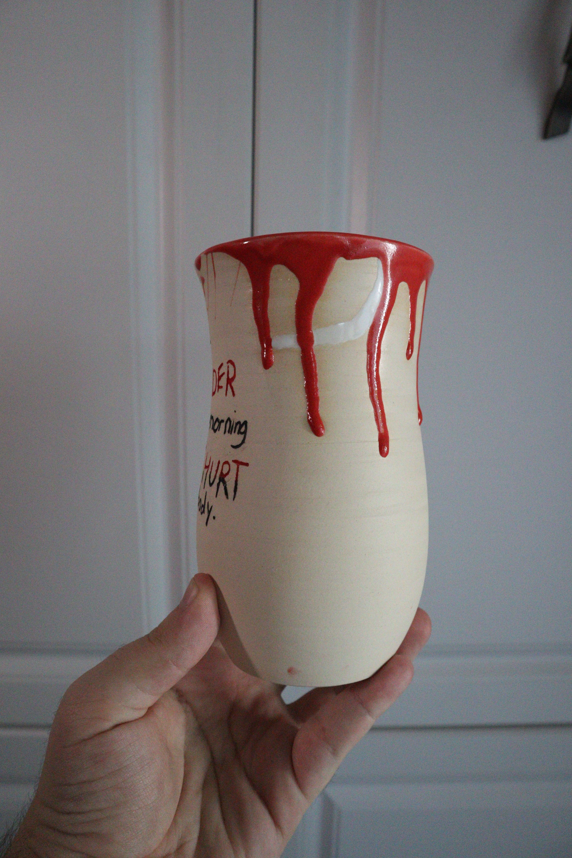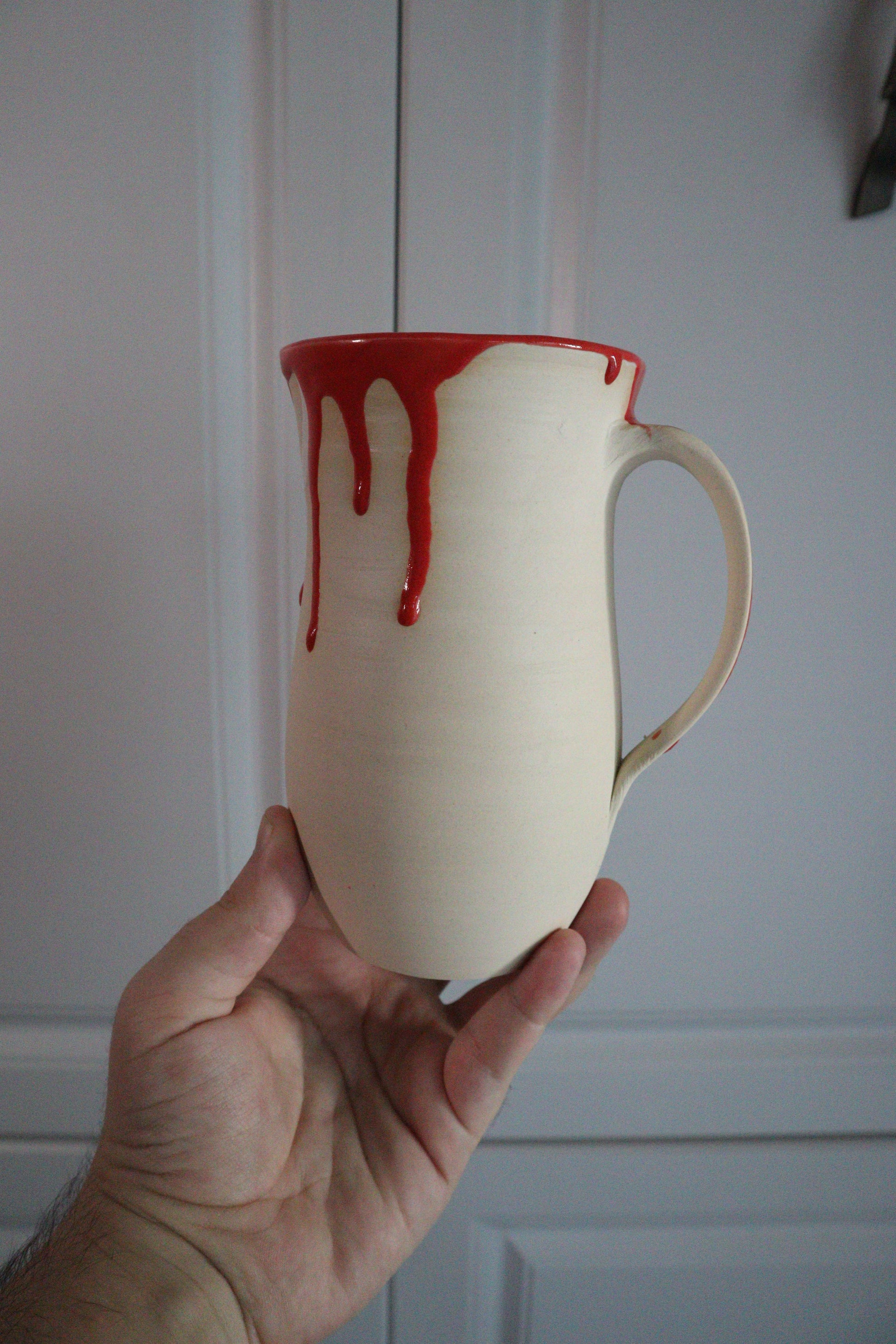 Hand-carved and ready to hold 12+ ounces of your brews, elixirs, or midnight coffee. Its raw, unglazed exterior contrasts hauntingly with the blood-red glaze, giving it an eerie, otherworldly texture. Don’t fear — it’s still completely food-safe, dishwasher-safe, and microwave-safe.