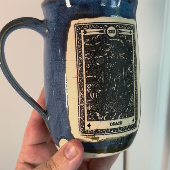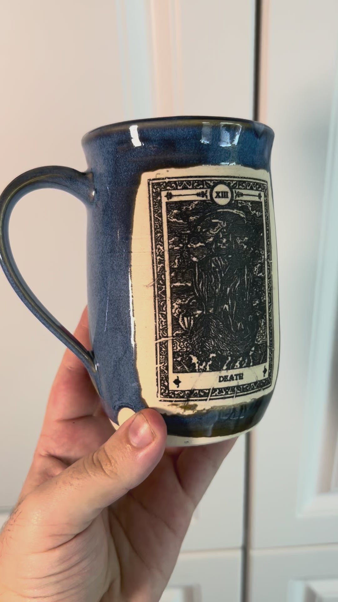 Awaken your transformation with this hand-crafted mug, stamped with the Major Arcana Tarot Card, “Death.” The energy of Death embodies endings, rebirth, and transformation—reminding you to release the old and embrace new beginnings with every sip. Holding over 12 ounces, it’s the perfect vessel for coffee, tea, or any daily ritual. Fully food-grade, microwave-safe, and dishwasher-safe, it’s as practical as it is mystical.