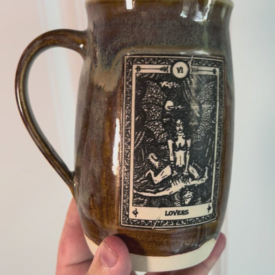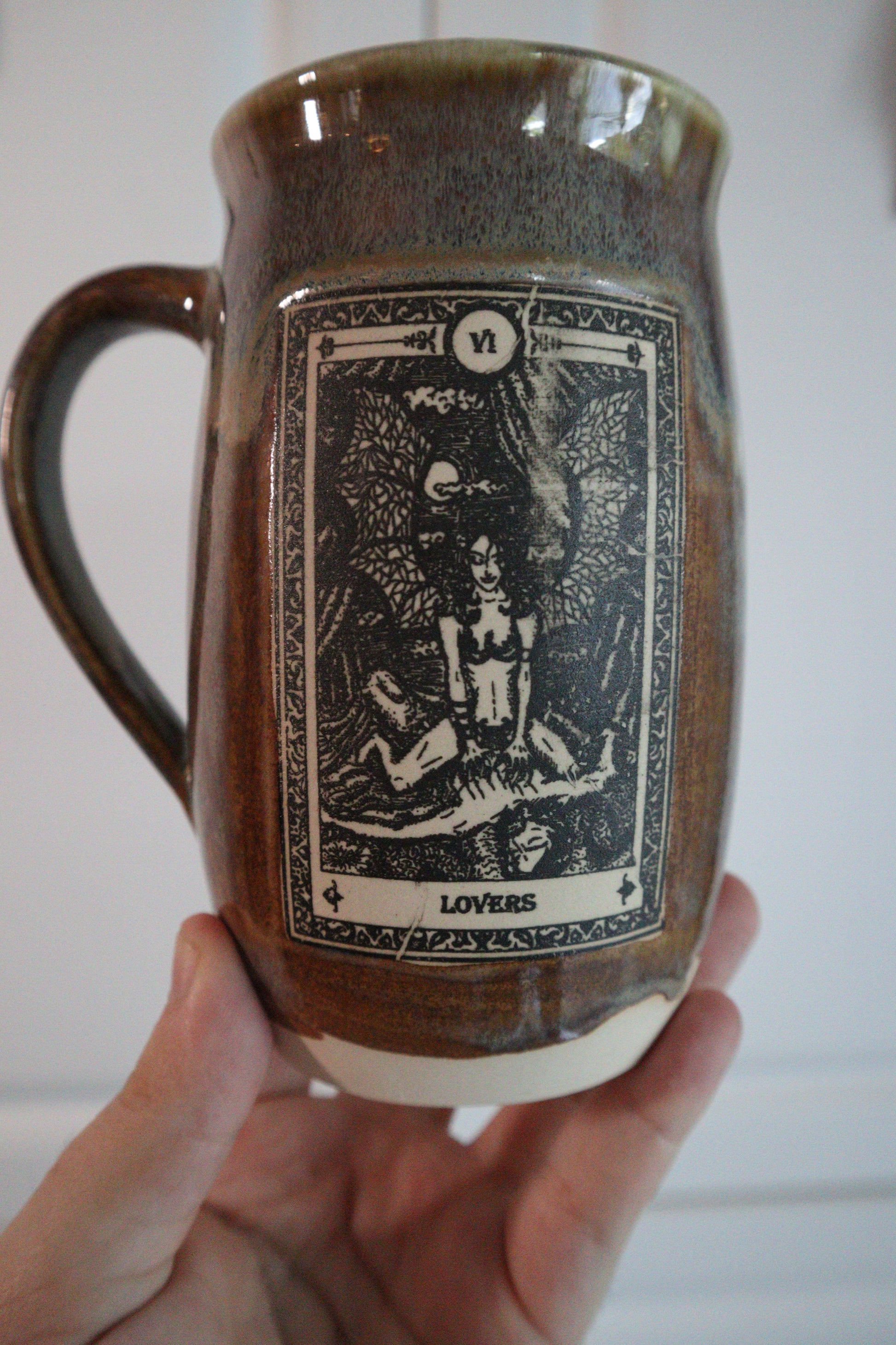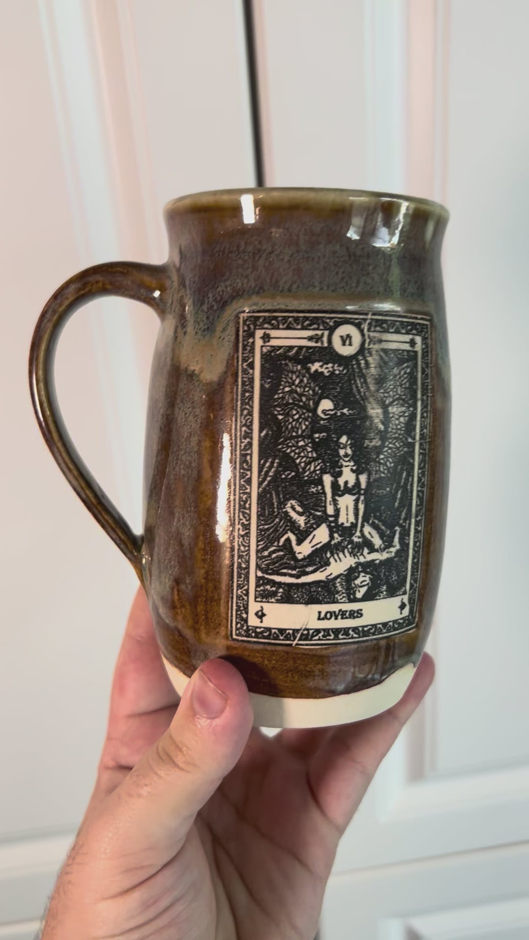 Awaken your heart with this hand-crafted mug, stamped with the Major Arcana Tarot Card, “The Lovers.” The energy of The Lovers calls forth harmony, connection, and alignment—reminding you to nurture love, balance, and meaningful choices with every sip. Holding over 12 ounces, it’s the perfect vessel for coffee, tea, or any daily ritual. Fully food-grade, microwave-safe, and dishwasher-safe, it’s as practical as it is mystical.