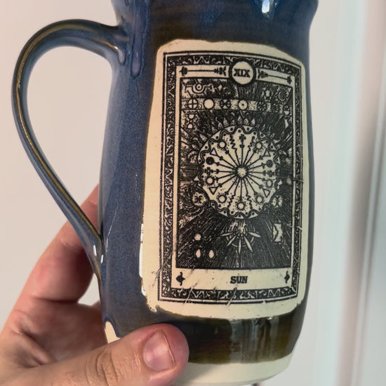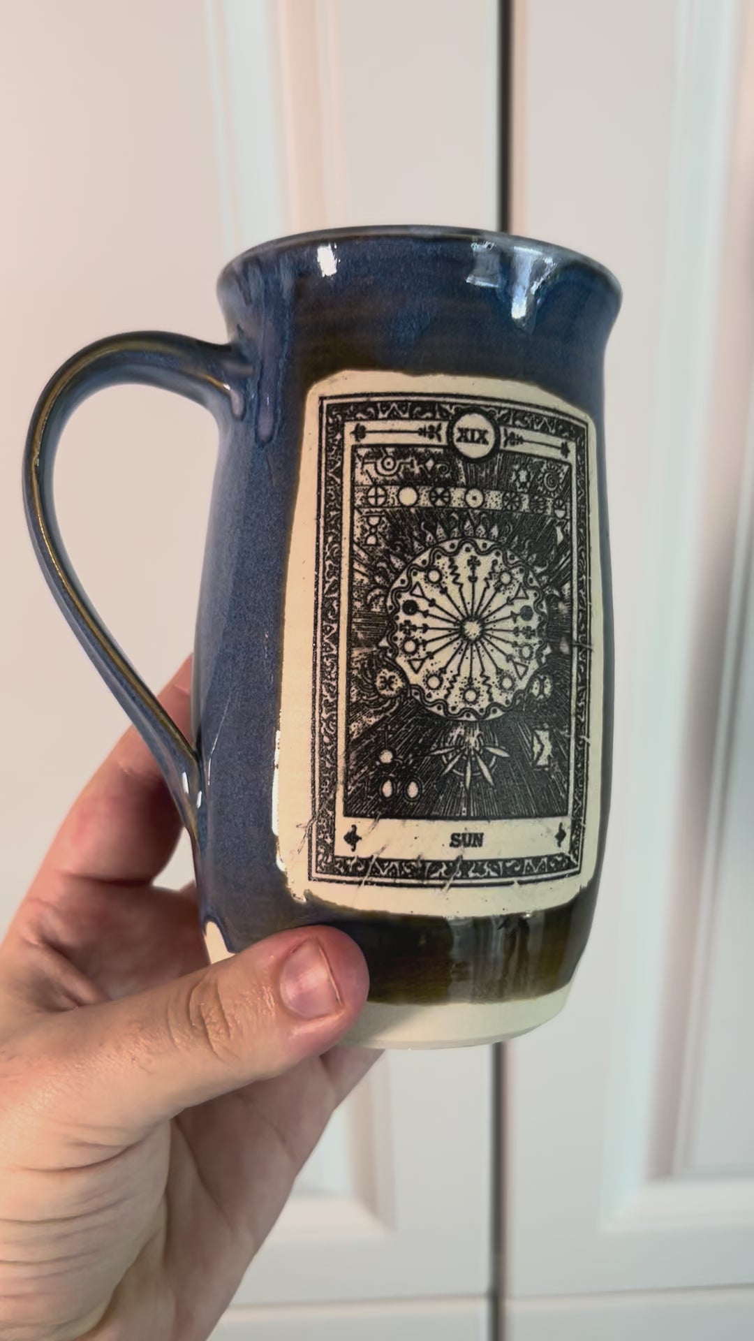 Awaken your joy with this hand-crafted mug, stamped with the Major Arcana Tarot Card, “The Sun.” The energy of The Sun radiates vitality, success, and positivity—reminding you to embrace warmth, clarity, and celebration with every sip. Holding over 12 ounces, it’s the perfect vessel for coffee, tea, or any daily ritual. Fully food-grade, microwave-safe, and dishwasher-safe, it’s as practical as it is mystical.